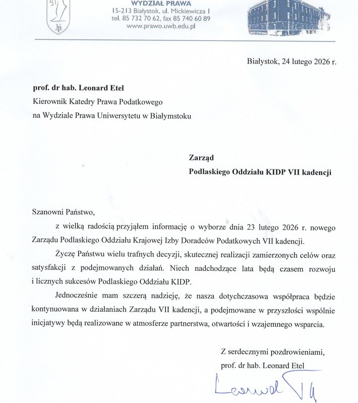 List gratulacyjny dla nowo wybranego Zarządu Podlaskiego Oddziału KIDP